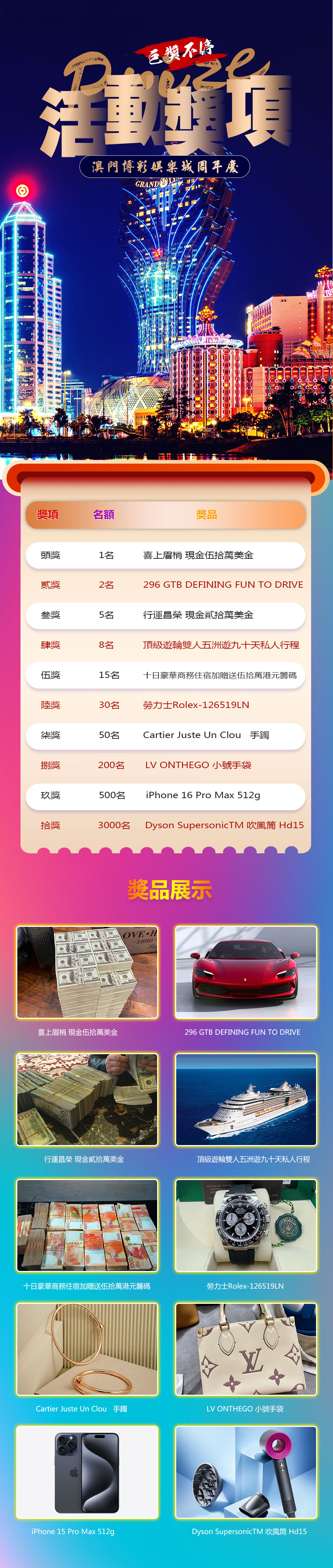 伍獎 | 十日豪華商務住宿加贈送伍拾萬港元籌碼 贊助商:銀娱優越會 |